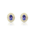 An exquisite play of brilliance — these earrings feature vivid oval tanzanites framed by twin halos of fine diamonds, set in luminous yellow gold for timeless sophistication.