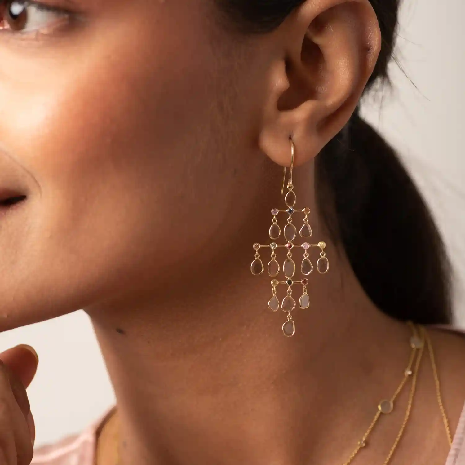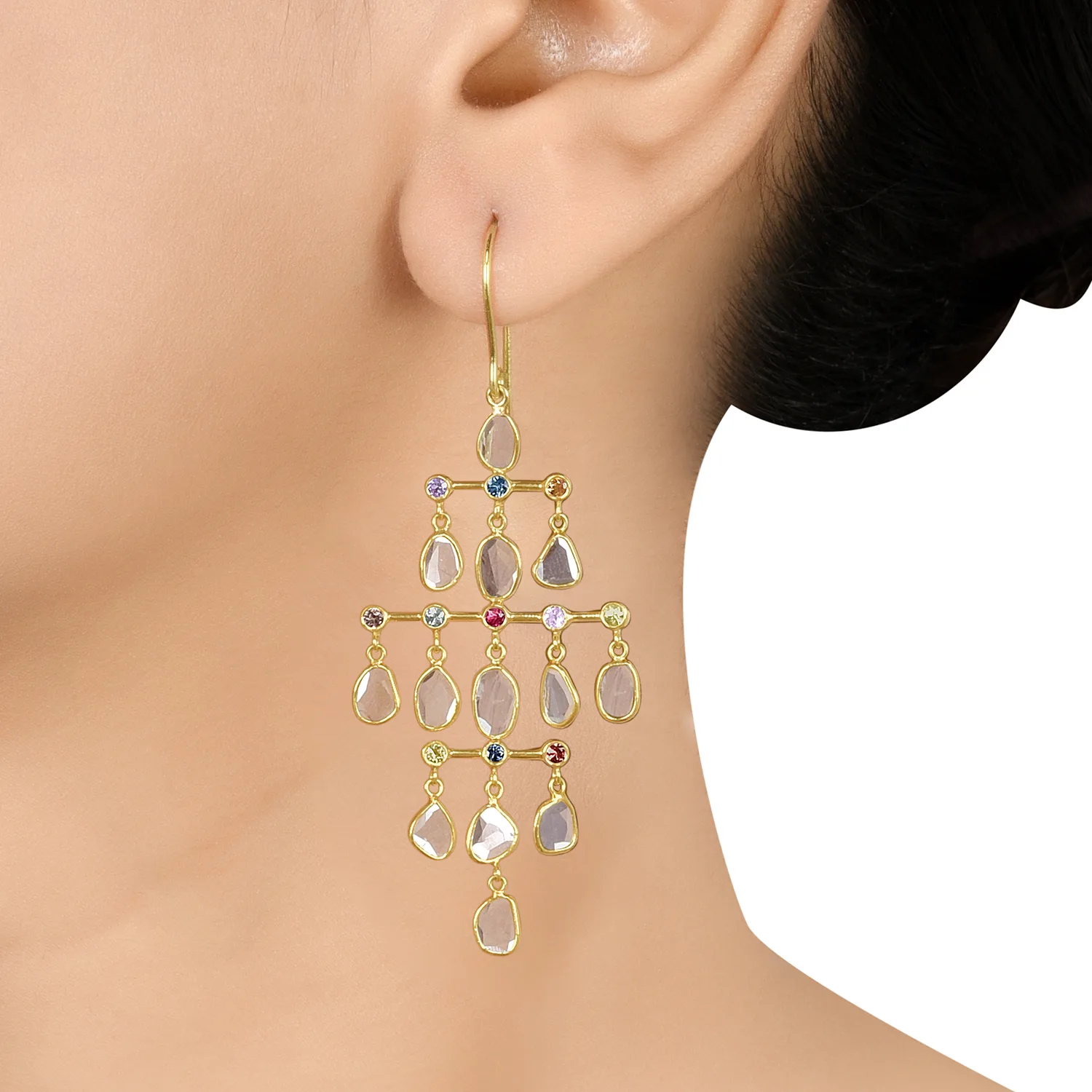 Cascading elegance in these gold-tone chandelier earrings, set with a mix of raw polki diamonds and colorful sapphires.