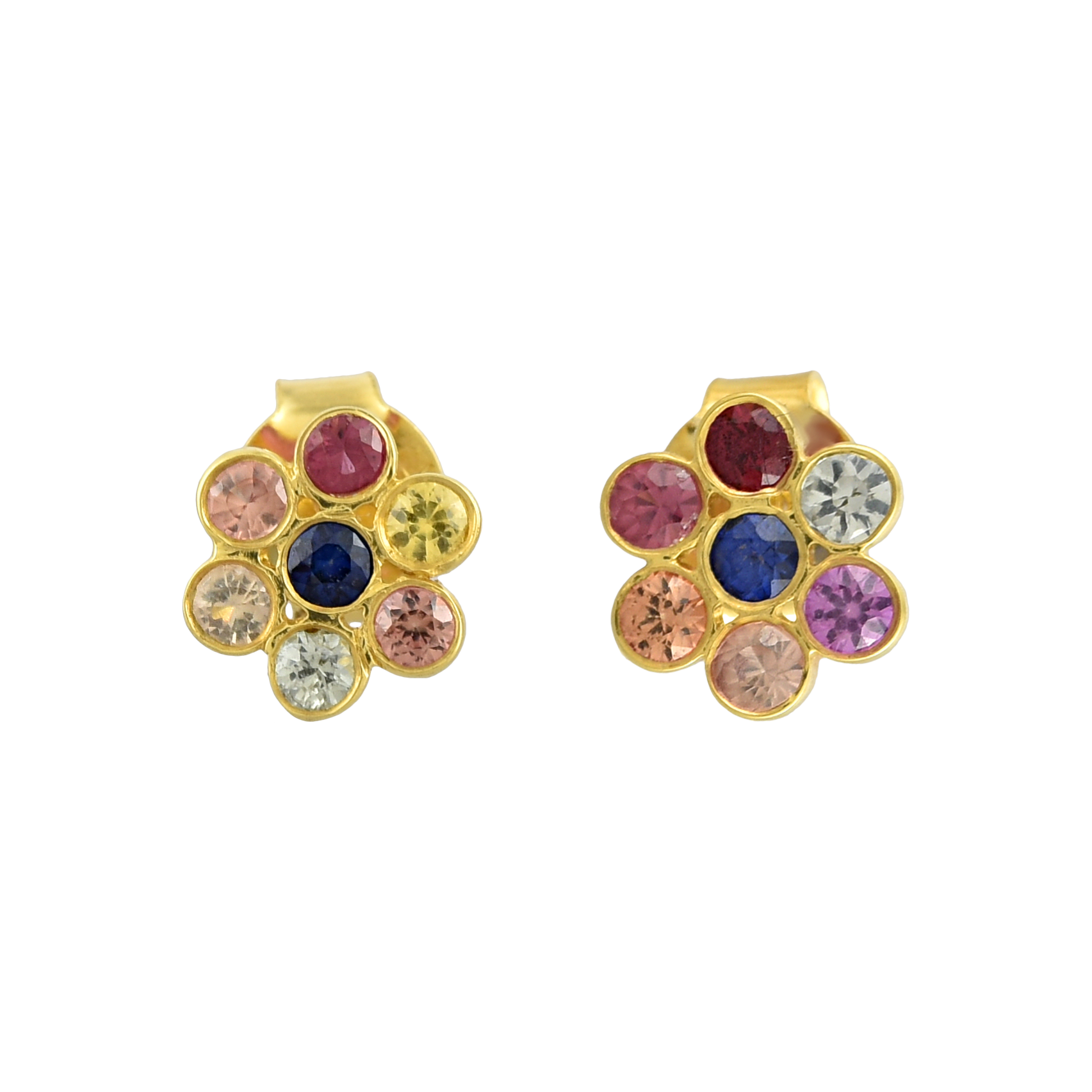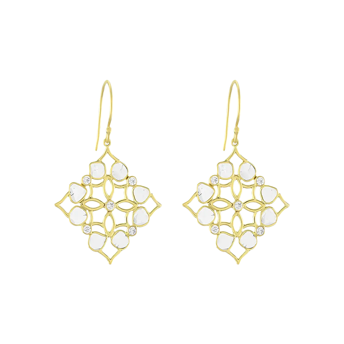 Elegant gold-tone earrings featuring the raw, uncut beauty of polki diamonds in a sophisticated floral design. A perfect blend of heritage and modern luxury.
