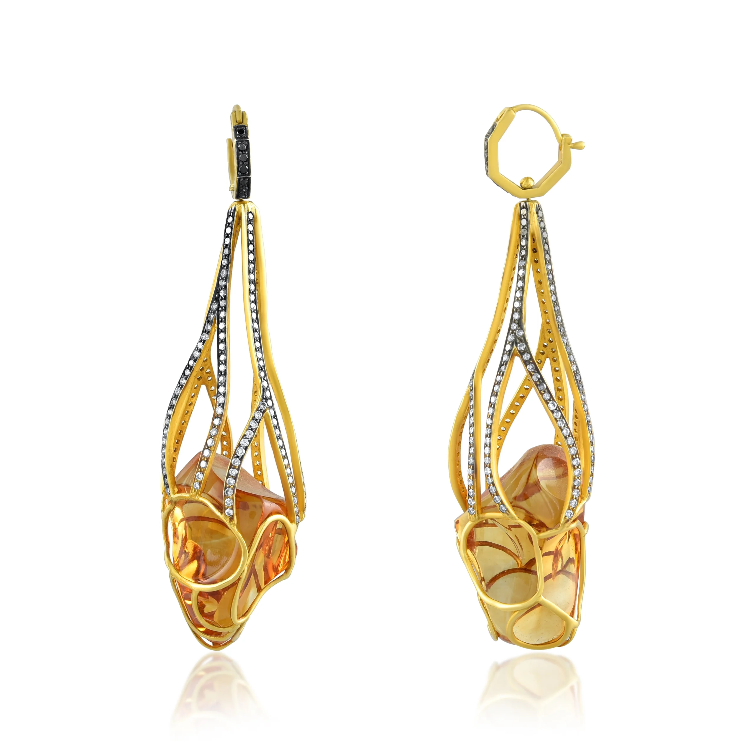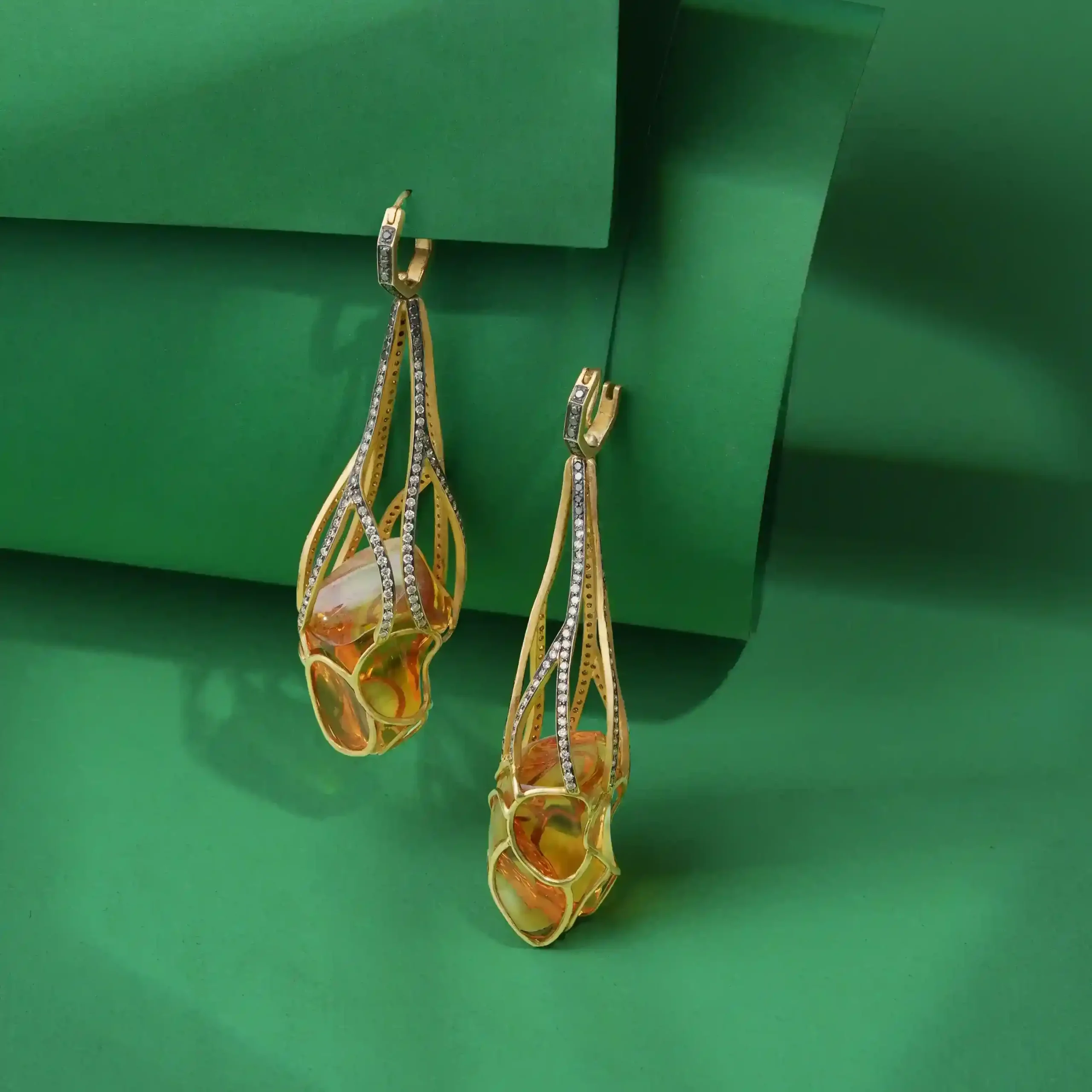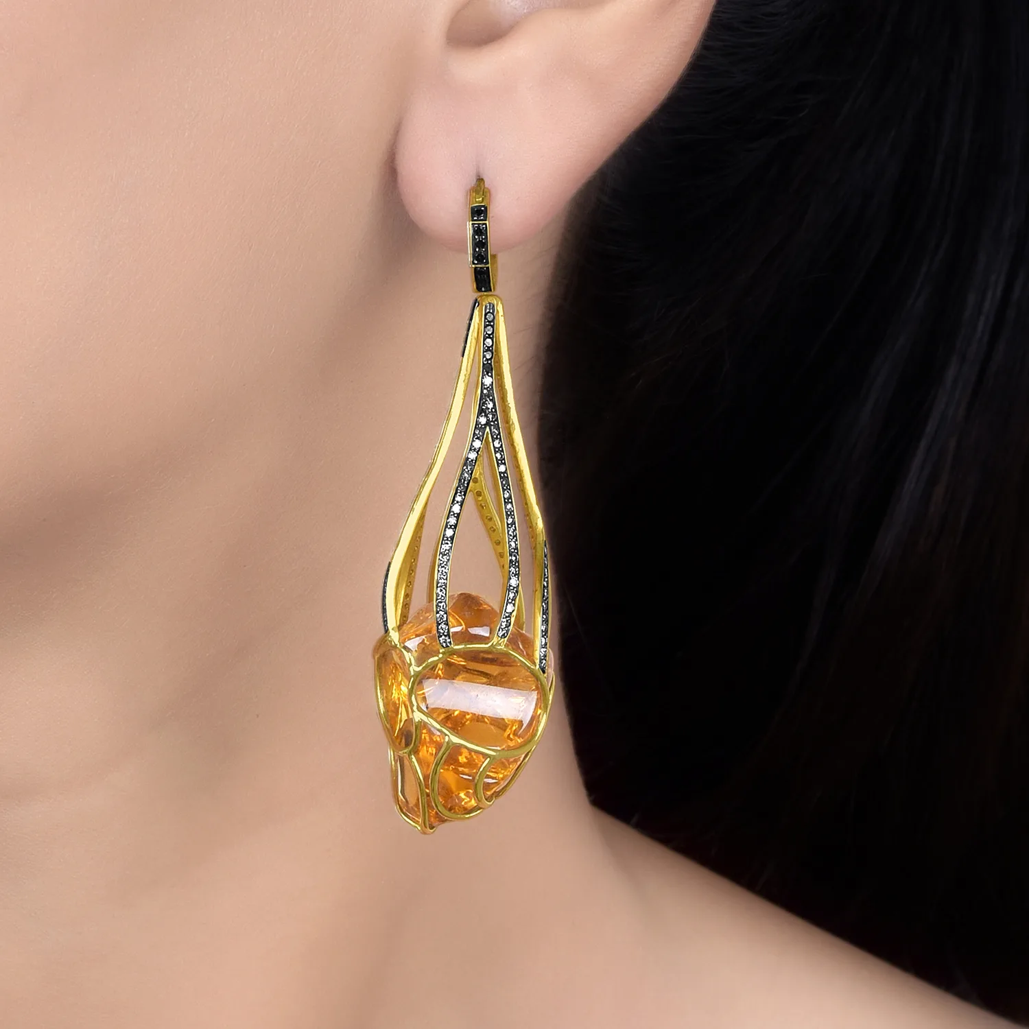 Exquisite gold-tone earrings adorned with radiant citrine and fine crystal detailing. Sculpted in fluid, organic forms — a poetic expression of elegance and timeless allure.