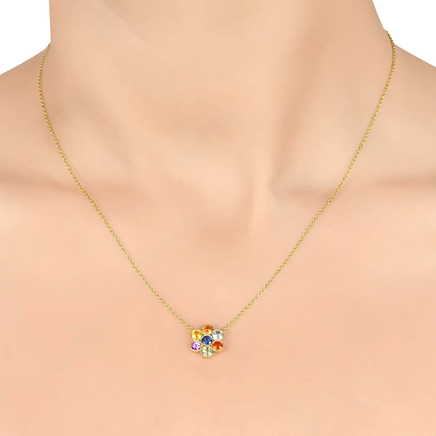 Gold chain with a multicolored sapphire floral pendant. Playful, elegant, and adds a pop of color to any look.