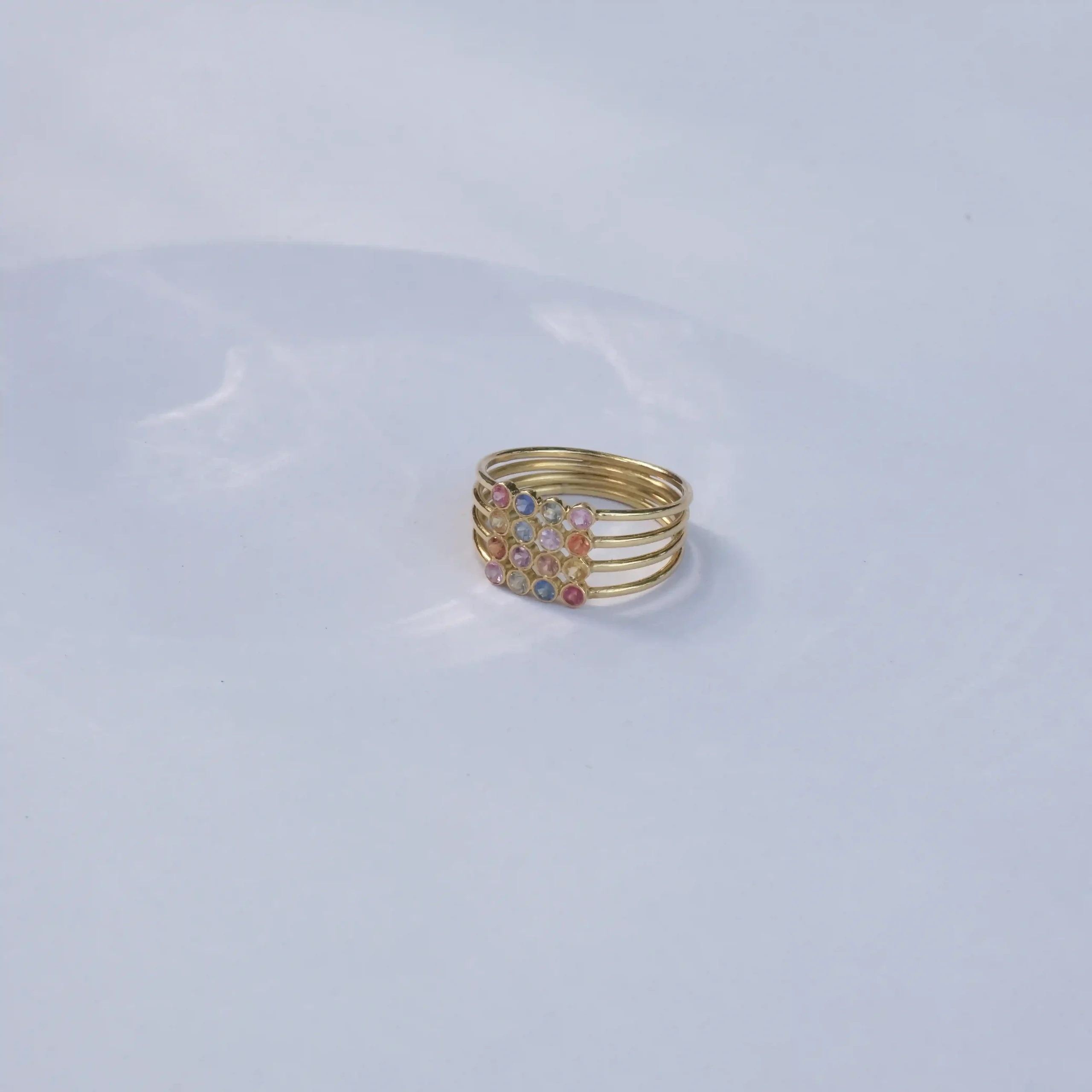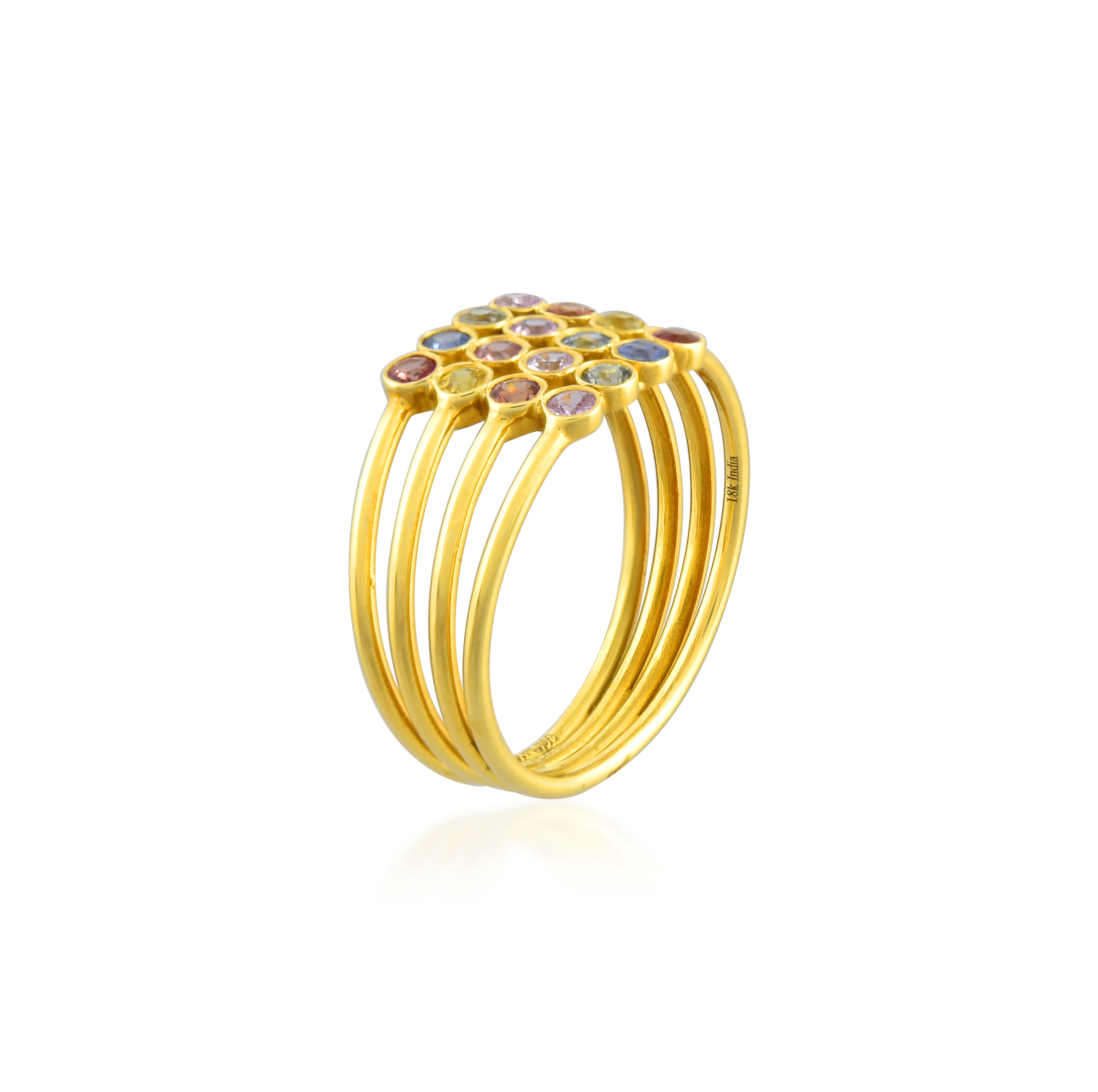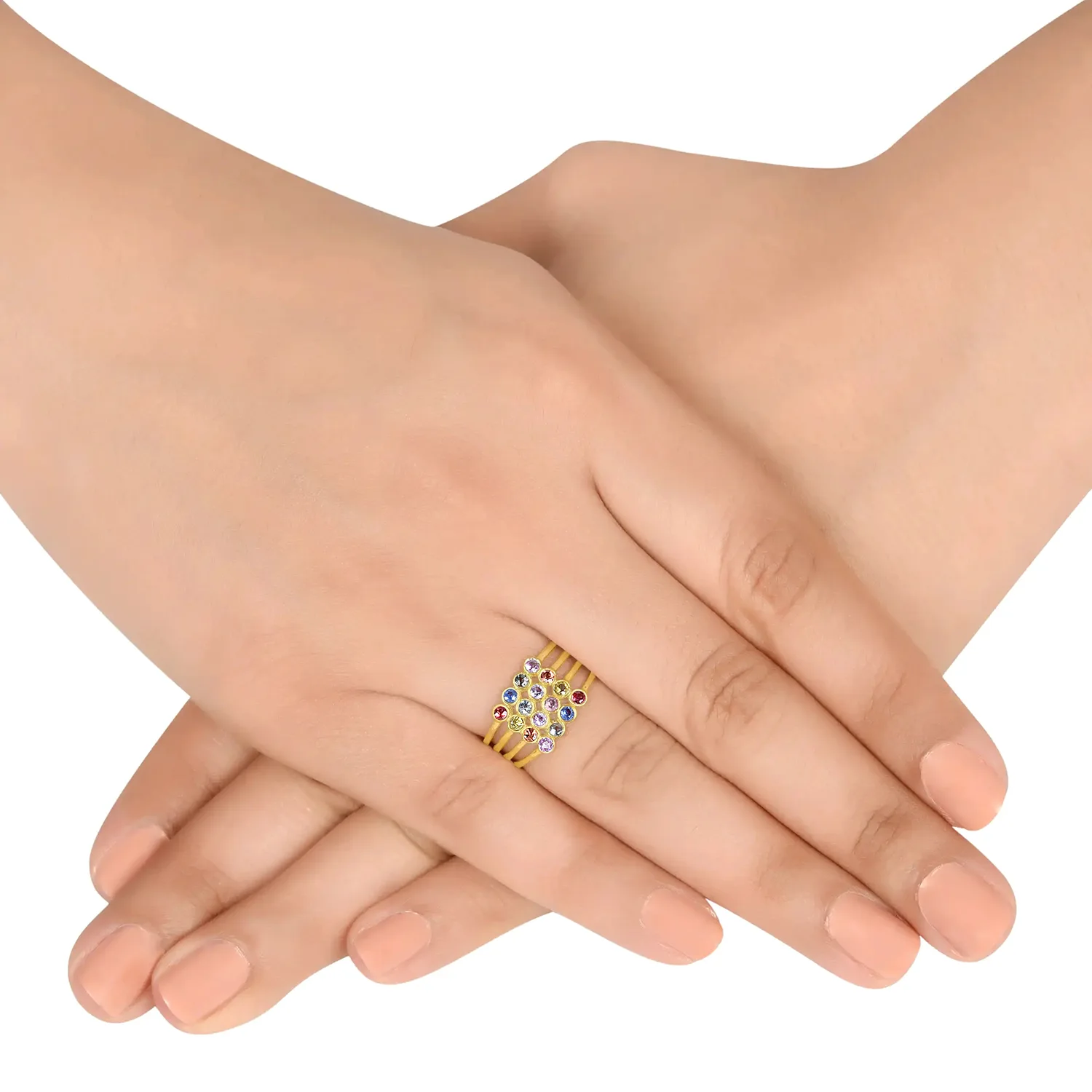 Gold-plated multi-band ring with colorful stones. Vibrant, stylish, and eye-catching.