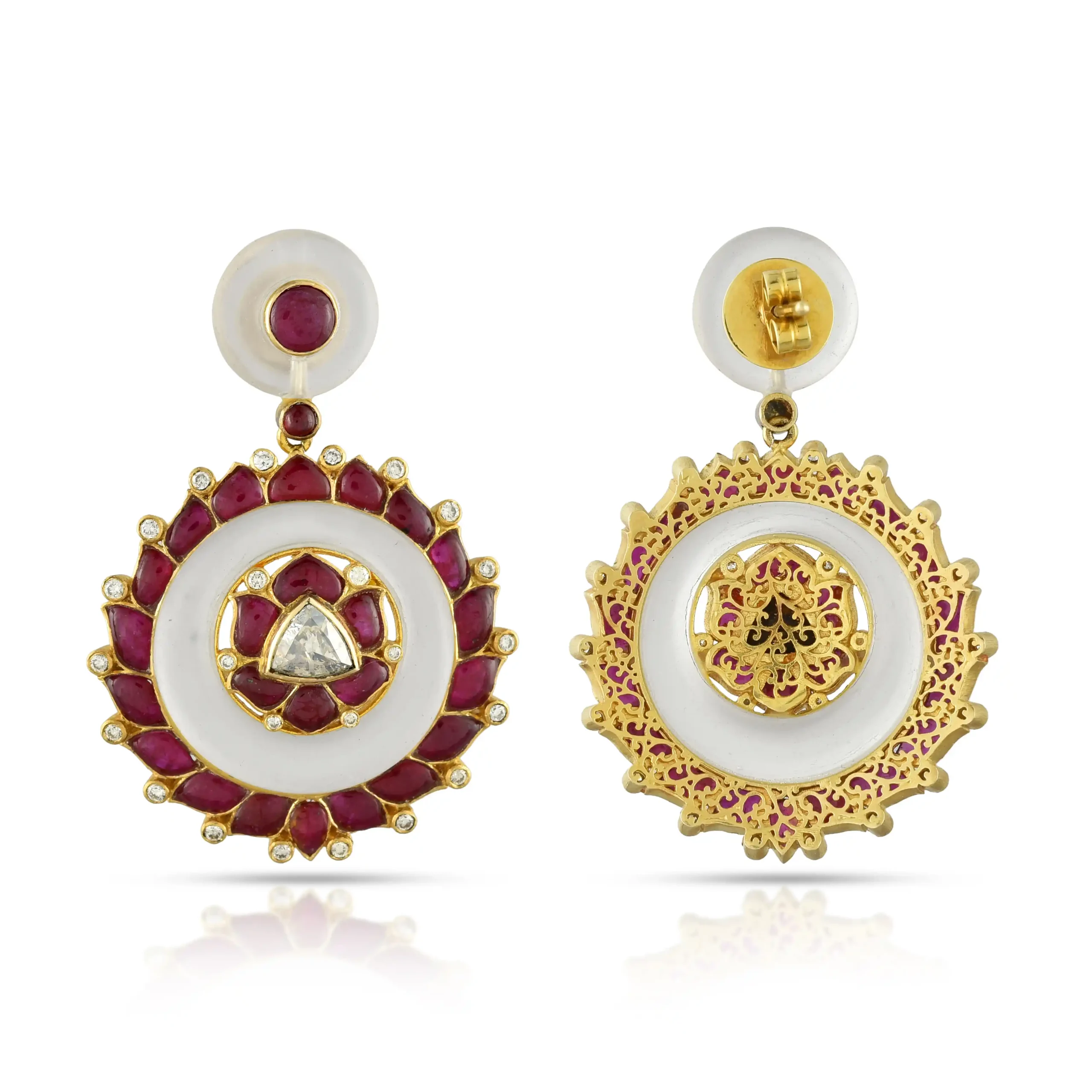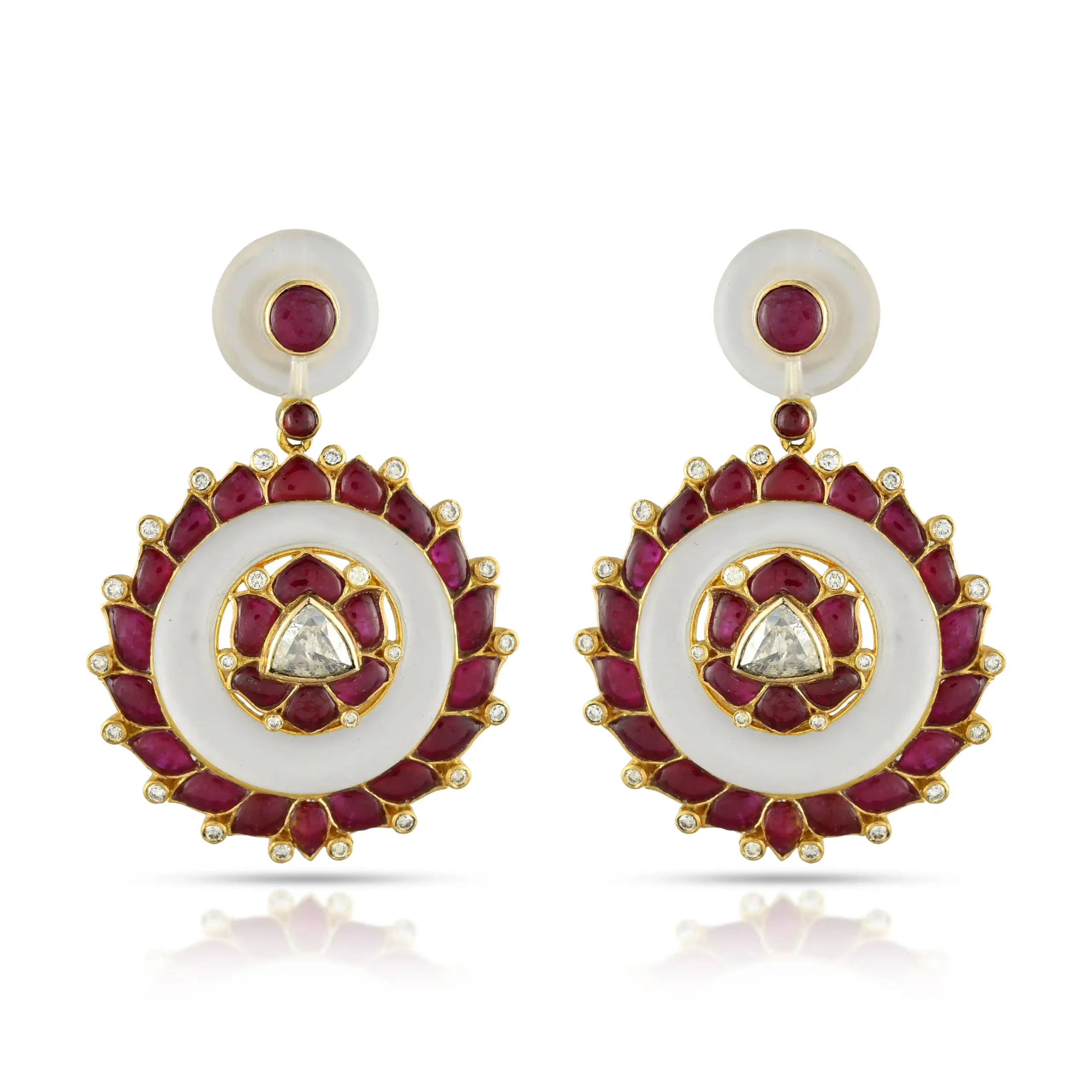 Statement earrings centred around lustrous rubies, framed in a sculpted circular form and finished with discreet crystal accents for soft brilliance.