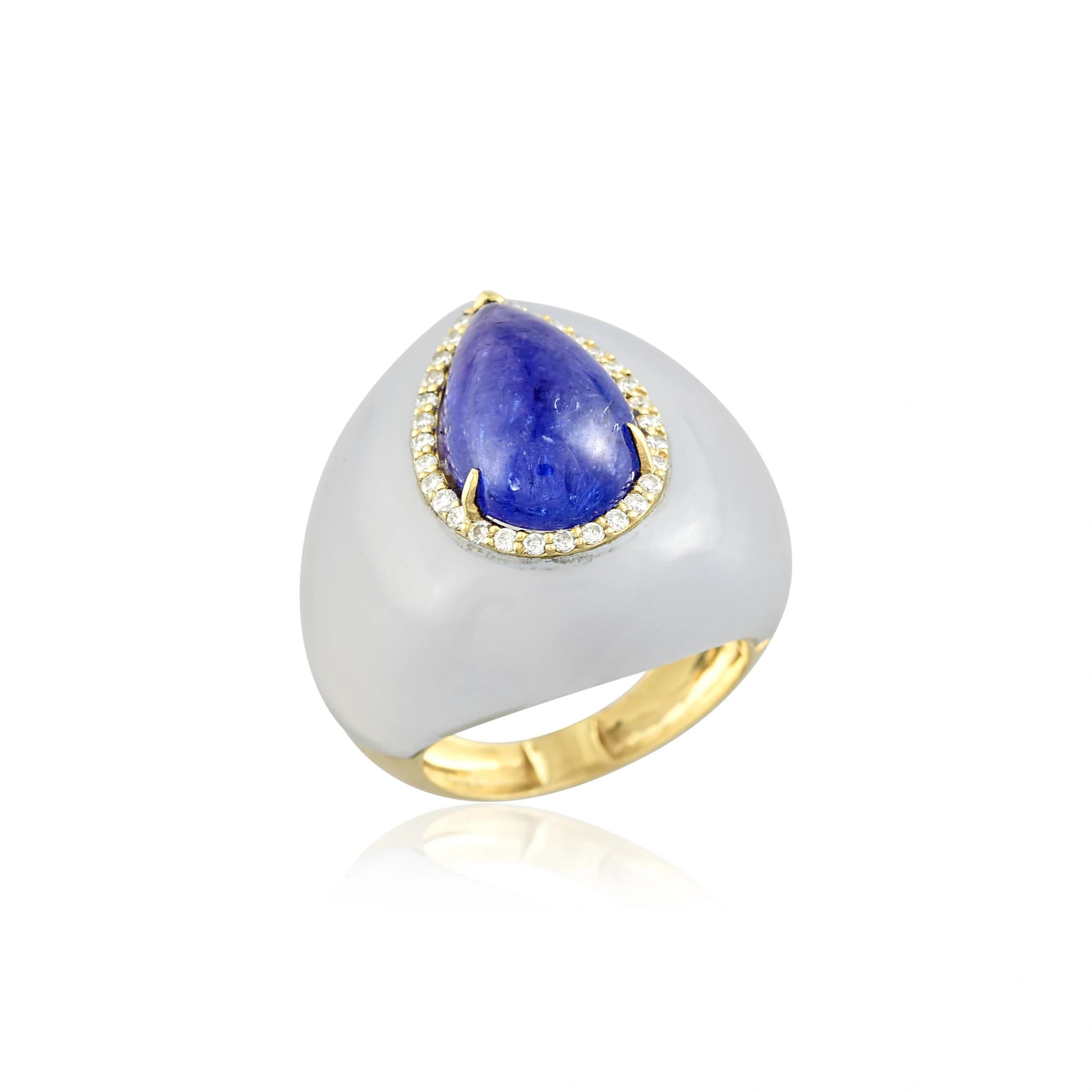 Crafted in gold, this sculptural ring features a luminous tanzanite set atop chalcedony, encircled by fine diamonds — a study in modern elegance.