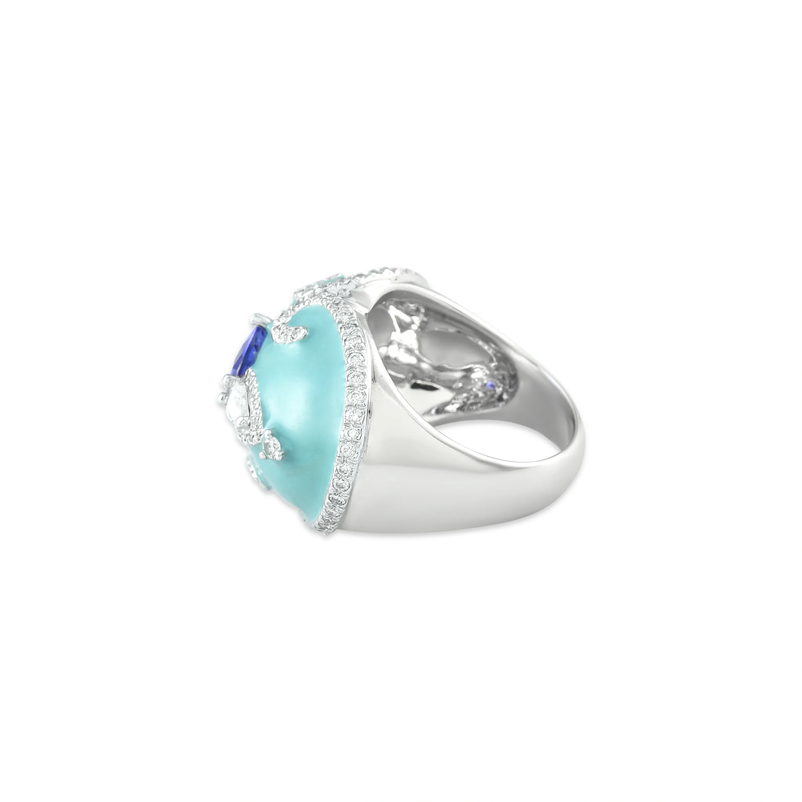 The deep blue of tanzanite contrasts beautifully with serene turquoise enamel and white gold, creating a design that’s both artistic and timeless.